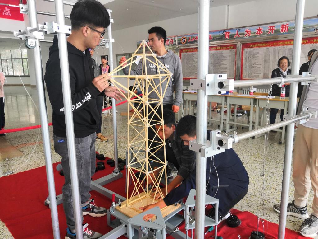 开幕式结束后在4号楼一楼大厅进行结构模型展览和加载试验。首先是专业教师和员工代表分别从模型的合理性、创新性、制作质量、美观性和实用性等几个方面进行评分;然后,各参赛队伍进行现场陈述,介绍结构的具体承载能力、加载点、结构的特点;最后是最激动人心的加载环节,通过加载仪器对模型的承载能力进行试验。整个加载过程中参赛同学们认真观察其他作品的表现,不断反思不足,取长补短,互相鼓励,都得到了很大的收获。