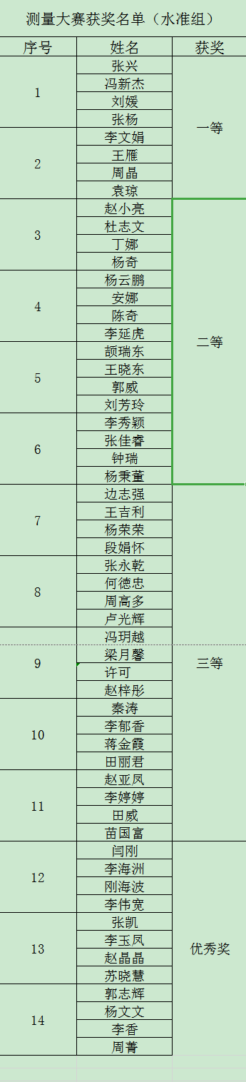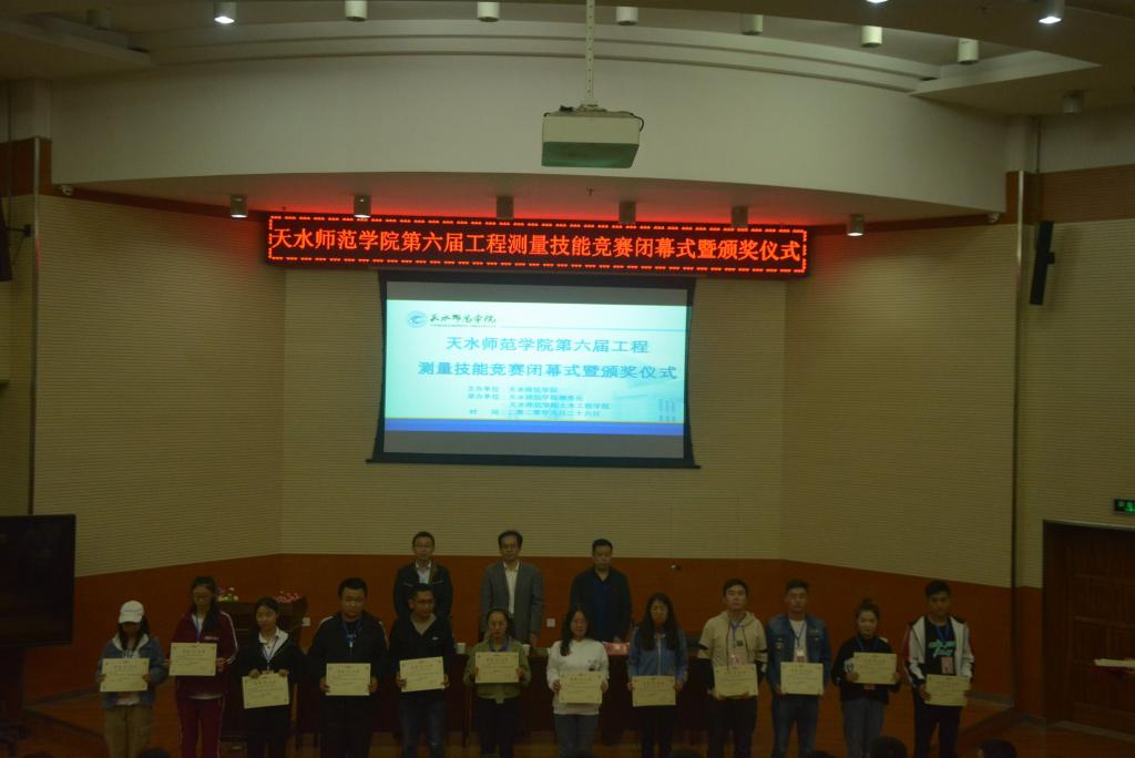 经过一天的紧张比赛和裁判组老师严肃、公正的评判,最终有28个队112名同学获奖,其中水准测量组一等奖2个队、二等奖4个队、三等奖5个队,优秀奖3个队;导线测量组一等奖2个队、二等奖4个队、三等奖5个队、优秀奖3个队。