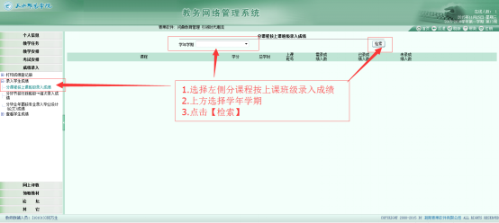 注意:首先选择“分课程按上课班级录入成绩”,然后再右侧选择学期学年,再点击“检索”,检索出需要录入的课程,点击课程后的“录入”,开始录入员工成绩。