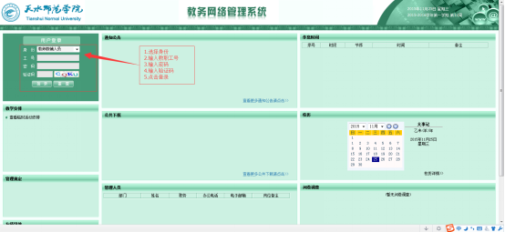 1.在浏览器(建议IE8以上,如显示有问题选择“兼容模式”)上登陆教务系统网页端http://210.26.24.55/jwweb(如图一所示)注意:登陆时在左上侧的控制面板选择“教师教辅人员”身份,工号为工资号,初始密码为工资号,输入验证码,点击登录即可进入系统。