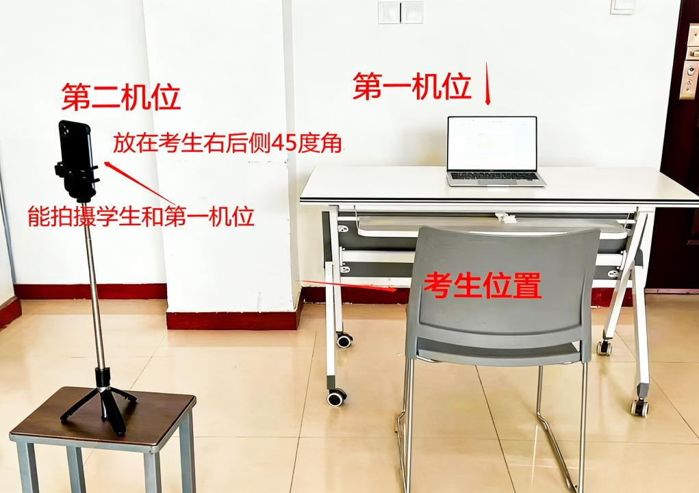 (2)用于监控应试环境的设备【辅机位】:电脑或手机(需带有摄像头、麦克风);从侧后方拍摄。