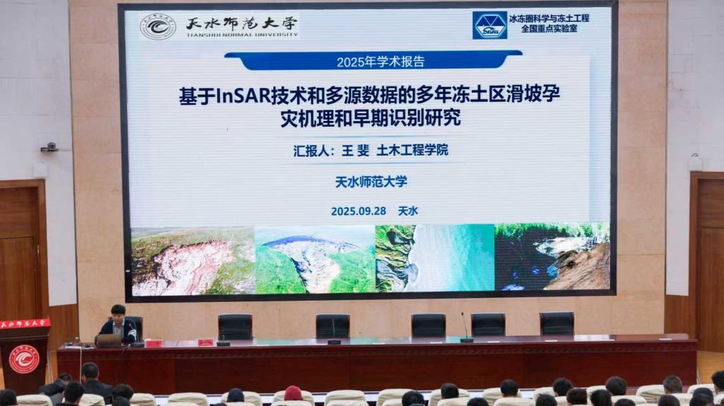 王斐博士作了题为《基于InSAR技术和多源数据的多年冻土区滑坡孕灾机理和早期识别研究》的报告,他聚焦多年冻土区滑坡地质灾害,利用合成孔径雷达干涉测量(InSAR)技术与多源数据手段,深入剖析了冻土滑坡的变形特征、孕灾机理及主要控制因素,揭示了监测区域冻土滑坡的时空分布规律,提出了适用于早期识别的变形速率阈值,建立了多年冻土区潜在滑坡的早期识别技术及融合地表变形信息的冻土区滑坡易发性评估模型,为相关灾害的监测预警与防治提供了参考依据。