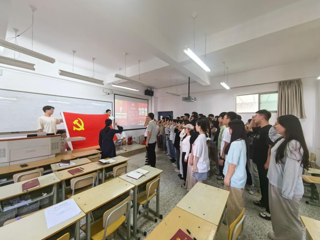 接下来,由老党员为2024年上半年新发展党员佩戴党徽,全体党员在组织委员陈庭芳的带领下,面向党旗庄严宣誓。让新党员感受入党的庄重和严肃,让老党员在党旗下接受心灵的净化和洗礼。